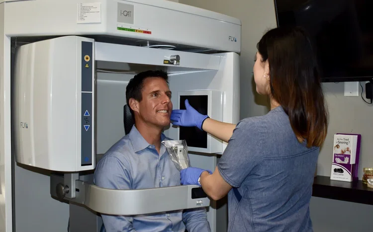 We can also use the CBCT technology to map a patient’s airway for our patients with sleep related breathing disorders, or Obstructive Sleep Apnea (OSA), This imaging provides us with an anatomical evaluation of your normal airway in an awake state and can help us in diagnosing why patients may have a sleep related breathing disorder. Although this image is taken while you are sitting and awake it does provide an analysis of your airway’s “starting point” and normal anatomy. When you sleep you are usually laying down and your muscles relax changing the airway structure and its opening. Because of this we will often also utilize Acoustic Oral Pharanygometry to supplement our evaluation. This diagnostic testing uses sound waves to measure your airway as it collapses in a more active and dynamic state. Additionally, the Cone Beam will provide an image of your nasal anatomy and possible obstructions encountered when breathing through your nose. To verify this we utilize an Acoustic Rhinometer (nasal sound wave imaging) to evaluate how easily air passes through each nostril. All of these diagnostic resources give us the most state of the art and comprehensive methods for diagnosing and evaluating our patients.