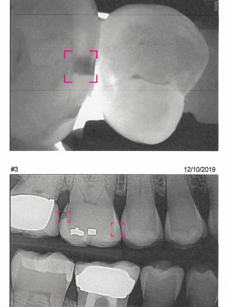 The image on top (to the left) was taken with the newest of technologies, CariVu, to assist in diagnosing the existence of decay or fractures in teeth at the earliest of stages. Having this diagnostic tool allows for the most conservative of treatment and early detection. The image was attained by transmitting an infrared light (with no radiation) through the tooth. This trans-illumination captures an image that is generated to our dental software program. The dark shadow highlighted by the pink box in this top image indicates decay that was undetectable in a traditional two dimensional X-ray (right pink box shown beneath it). The traditional digital X-ray does not reveal this same decayed area on the right side of the tooth (the pink box on the right side of the middle picture). The two dimensional dental X-ray only reveals a decayed area on the left side of the tooth (the dark shadow inside the pink box on the left side of the middle picture). In this case the area inside that left pink box was correctly treated by the dentist. However without being able to visualize any condition inside right pink box (without the aid of CariVu) the “invisible” decay on the right was left untreated. As with any medical or dental condition, the earlier a condition is diagnosed the more conservative and comprehensive the treatment can be.
